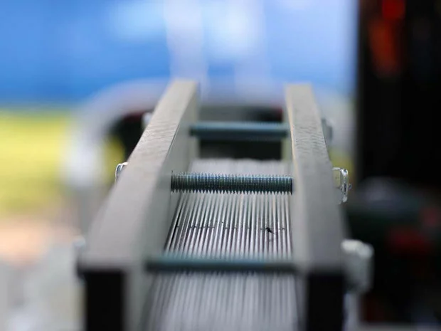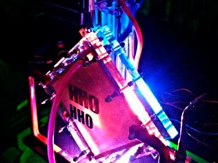 The principle is as ingenious as it is simple: All you need is mild soapy water and electricity for electrolysis (the best is from photovoltaic or wind power). The many narrow steel plates are highly efficient. In-between those plates there is a very mild soapy solution (3% soap in distilled water). By applying power to the plates, a large volume of flammable gas is produced.